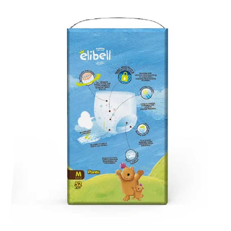 The cloth-like back sheet adds extra comfort, and the product is dermatologically tested, containing no chlorine bleaching, perfume, parabens, or latex. Elibell Premium Baby Pants offer safety, comfort, and peace of mind for you and your baby.