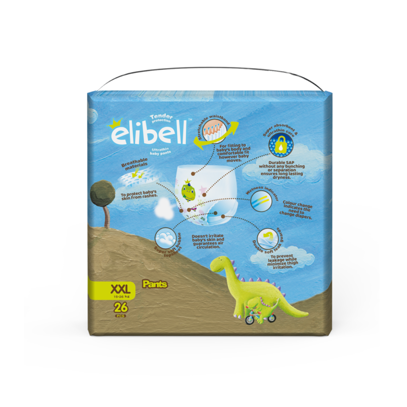 The cloth-like back sheet adds extra comfort, and the product is dermatologically tested, containing no chlorine bleaching, perfume, parabens, or latex. Elibell Premium Baby Pants offer safety, comfort, and peace of mind for you and your baby.